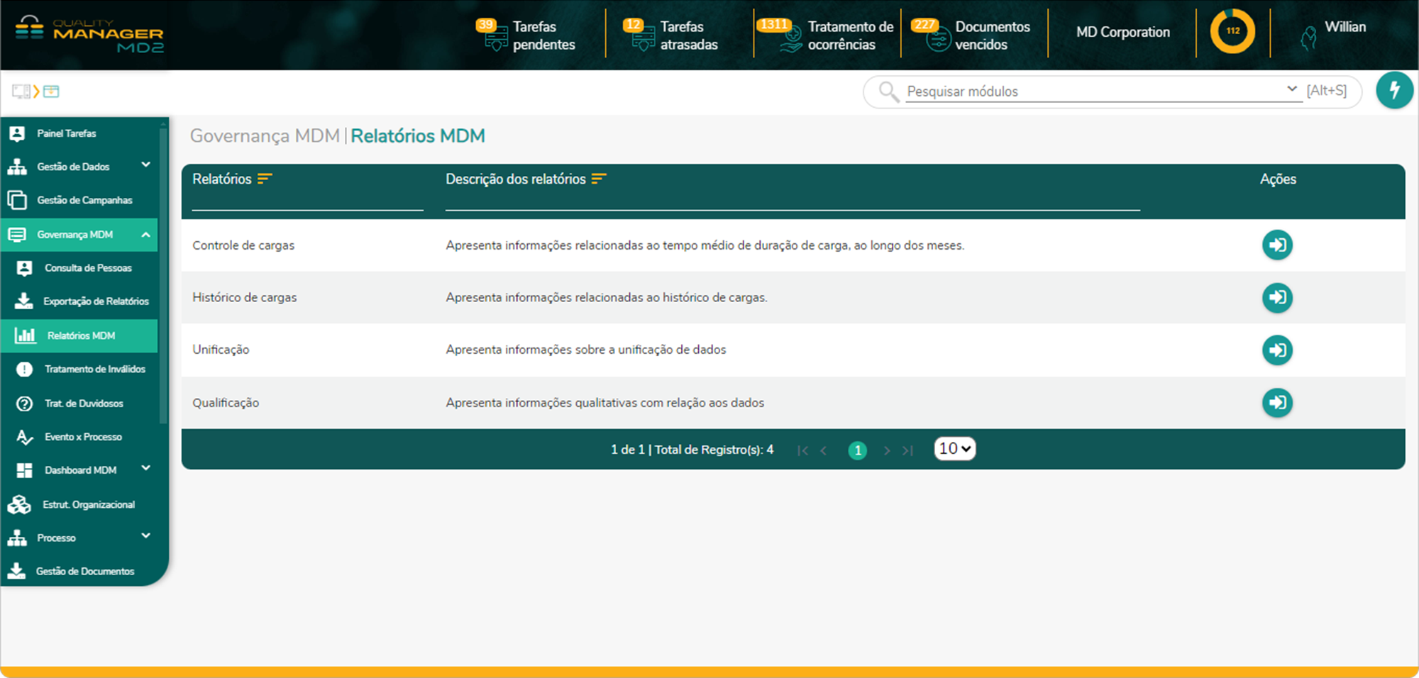 Via MD2 Quality Manager a solução MD2 MDM possibilita a consulta e emissão de relatório relacionados ao MDM. No link abaixo é possível verificar as informações acerca dessa funcionalidade.
