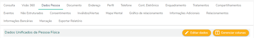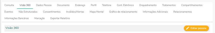 Caso o usuário já esteja visualizando os dados do titular a edição é permitida a partir do botão editar pessoa localizado na Aba Visão 360 ou no botão Editar dados localizado ao lado do botão gerenciar colunas nas Abas Dados Pessoa, Documento, Endereço, Perfil, Telefone, Contato eletrônico, Informações bancárias e Relacionamento.