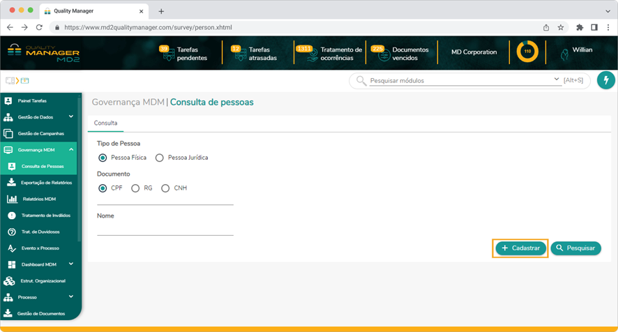 - Ao clicar no botão de cadastro, é possível criar um novo cadastro de uma pessoa na base local do Quality Manager.
