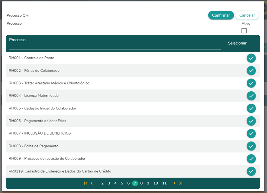 Para editar uma linha de eventos, o usuário poderá clicar em "Editar", e selecionar o processo de correspondência, informando se está ativo ou não, e após clicar em confirmar.